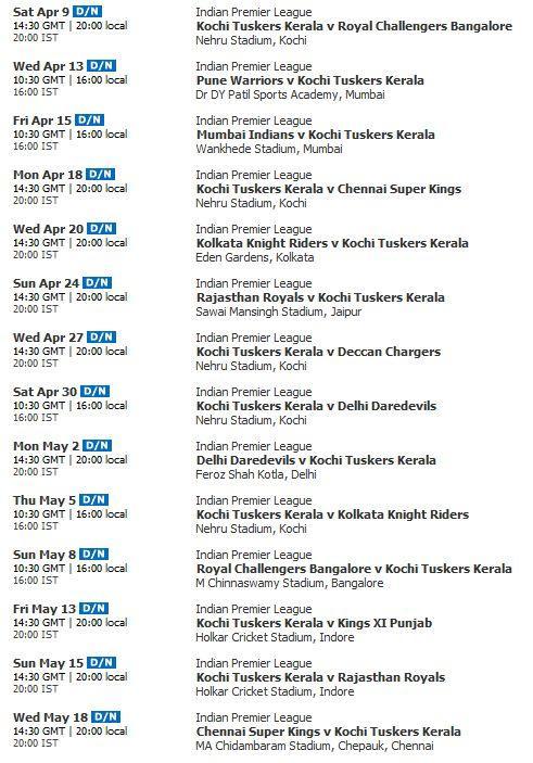 The logo of Kochi Tuskers Kerala consists of their name embedded on a shield along with two tusks, which resemble the Tusker. The logo itself much more alike a Tusker. Match Fixtures