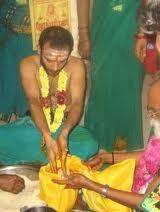 The Vrath starts on the day the devotee wear a mala (garland) either Thulasi Mala made of beads made out of Thulasi stem or a Rudraksha Mala (garland made out of Rudraksha beads) with a locket of Lord Ayyappan. This is known as Vratha Mudra Mala. This is to be accepted only after taking bath and doing traditional pooja of the family to the deity of the village or area, family deity etc wearing the wet cloth consequent of taking bath. On the first occasion at least and at all other occasions if possible, the mala is to be accepted from the priest of a temple or a Guru Swami also called the Periya swami. The Guru/Periya swami is one who has visited the Sabarimala temple several times and who can guide others on all matters of Sabarimala pilgrimage. The Mala will be sanctified in a temple or by special puja and then only given to the devotee. The devotee accepting and wearing the Mala gives a Dakshina (offering to the Guru) to the Guru/Periya swami. Once the devotee wears the Mala he is called as 'Ayyappan' or 'Swami'. He/she is identified with the Lord. The Mala has to be worn at sunrise facing East direction – facing the sun. As soon as the Mala is put on the neck, the devotee has to break a coconut to the deity of Ganapathi (Ganesha, Vinayaka, and Vigneswara) to ward off any obstacles for the Vratha observance. When the mala is accepted from the preist/Guru/Periya swami the devotee has to prostrate him and get the blessings from him. If the devotee has gone many times to Sabarimala and did puja and worn the same without a guru he should mentally respect and remember a Guru or the Lord Ayyappan. Daily life cycle of pilgrim